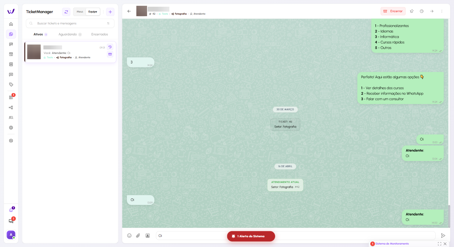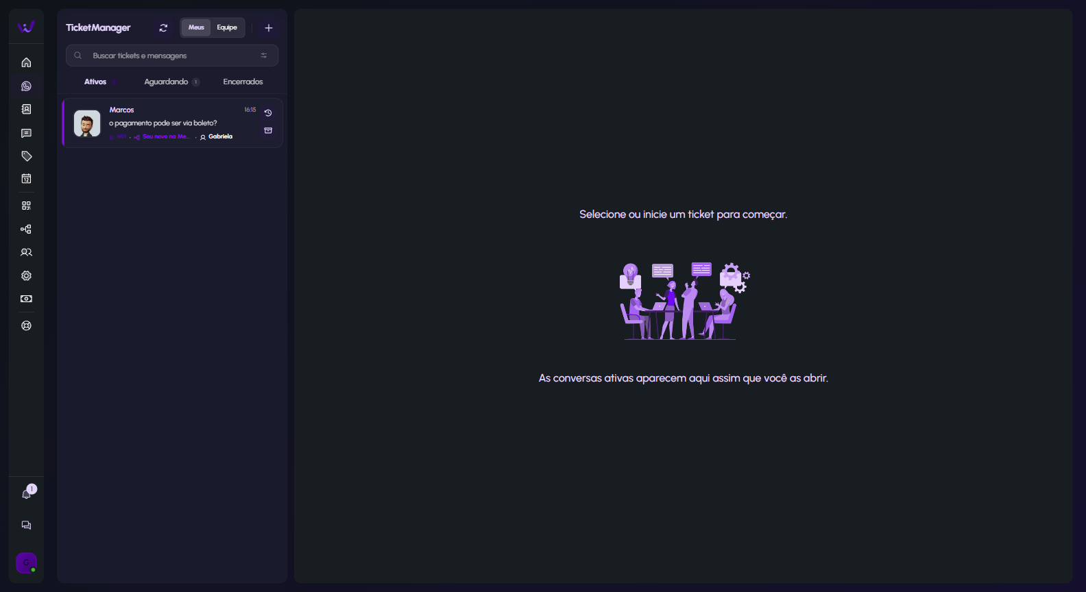 Tela de atendimento, para você atender clientes, iniciar conversar e organizar os atendimentos.