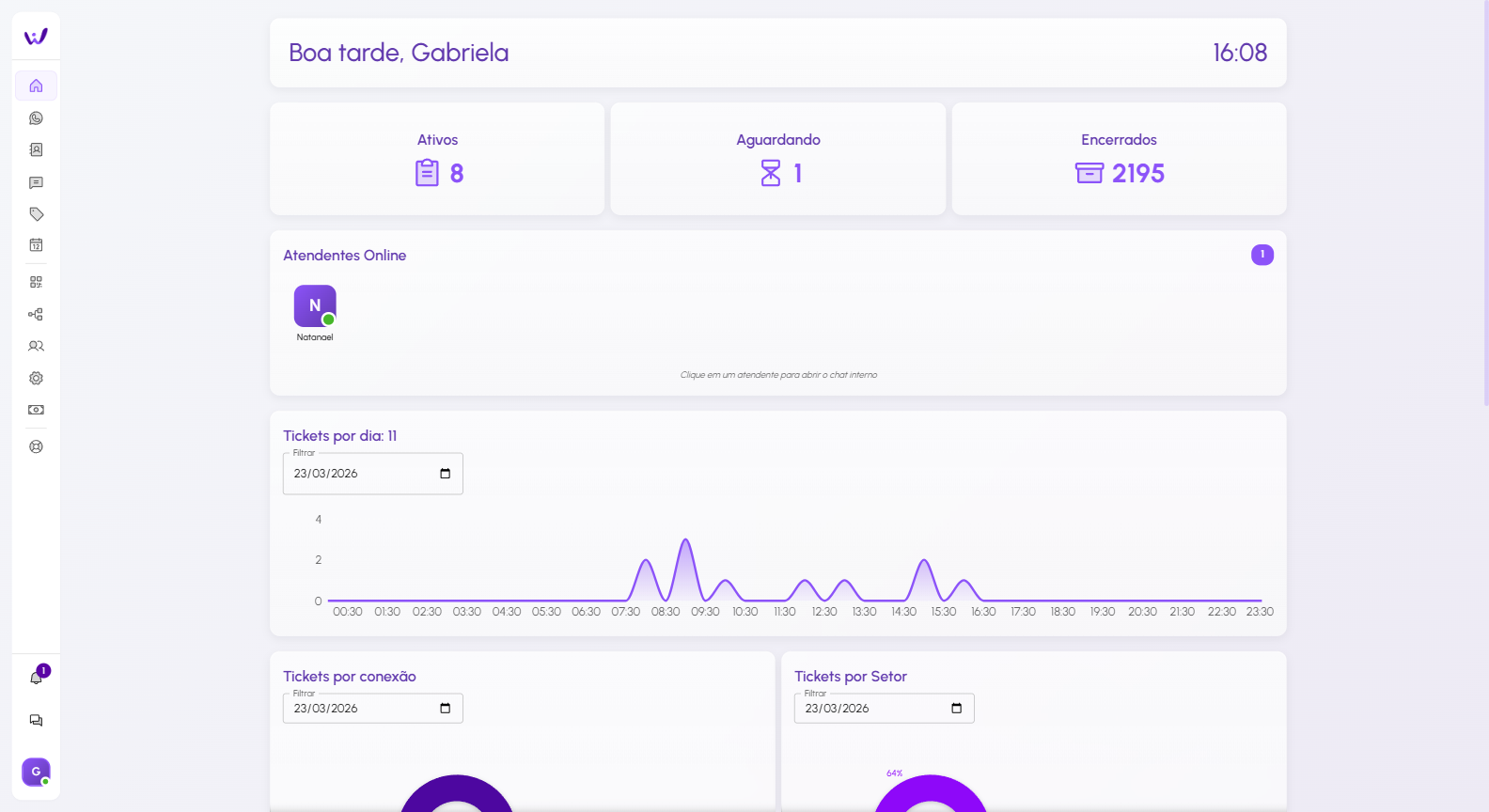 Dashboard do WaSap, mostra um resumo de tudo que esta acontecendo, atendimentos, agendamentos e mais.