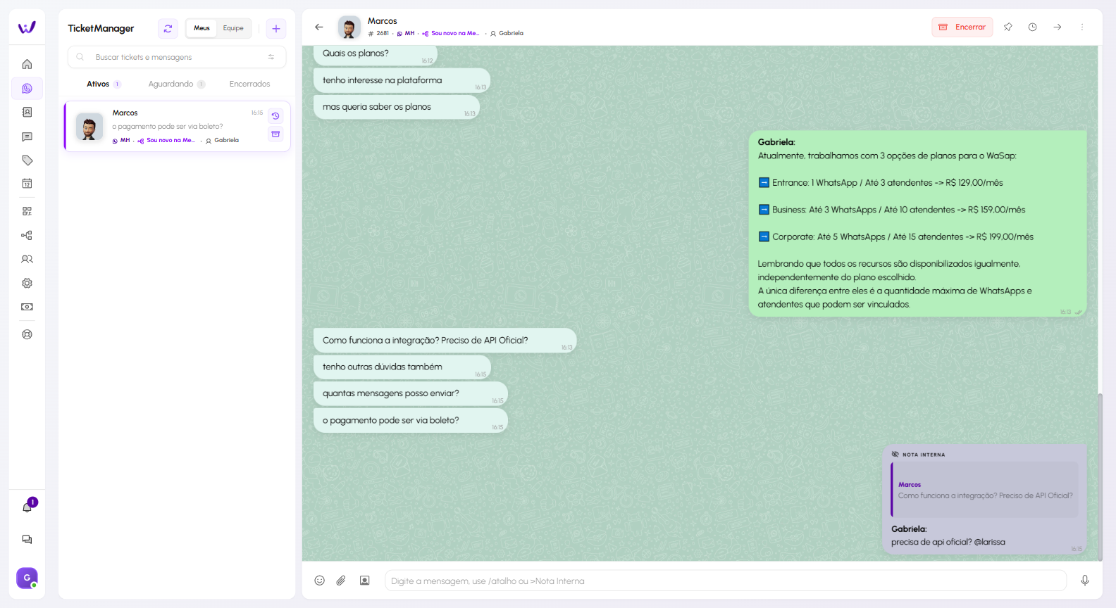O WaSap oferece um sistema exclusivo de chat interno, ideal para facilitar a comunicação e colaboração entre os colaboradores.