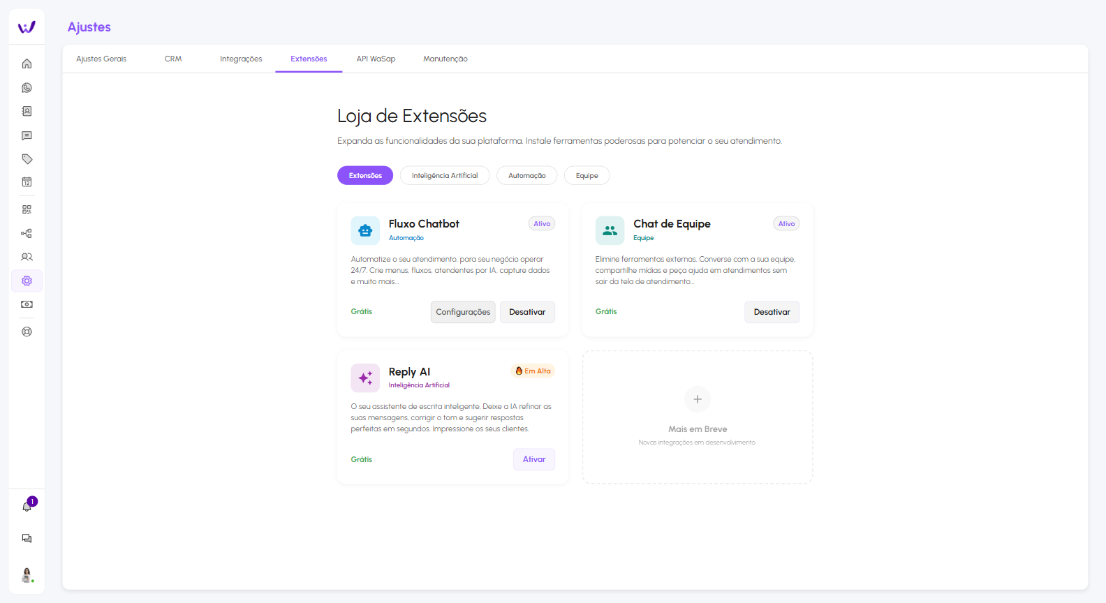 Com o WaSap, você conta com ferramentas inteligentes que organizam seus atendimentos de forma prática e eficiente, aumentando a produtividade e garantindo um suporte mais ágil e personalizado para cada cliente.